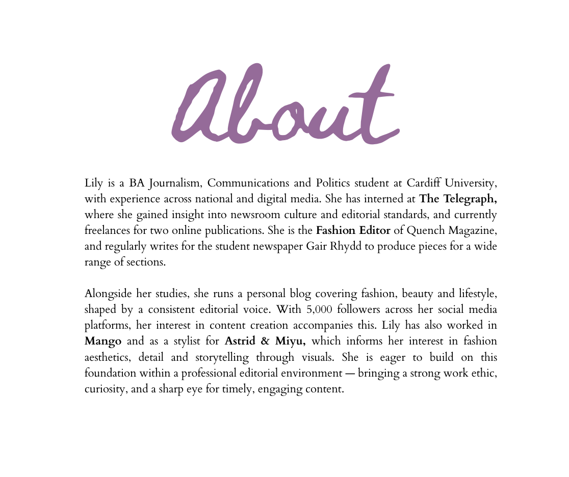 In a world of constant consumption, the content we choose to create and engage with has never been more important. From a young girl making blogs and edits to a woman now pursuing a career in media and marketing, Lily has always believed in the power of thoughtful, nourishing content. Her passion for fashion, beauty, and lifestyle has remained a constant—from childhood lip balm collections and an early obsession with Andie Anderson, to a current magazine archive and an ever-growing wardrobe. She is most interested in current affairs, fashion communication, PR, and Social Media.
